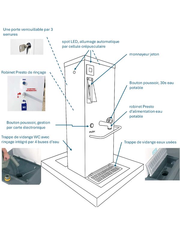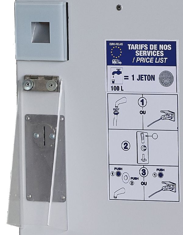 Une partie paiement : monnayeur jeton (1 jeton = 10 mn d'utilisation, soit environ 100l d'eau).
