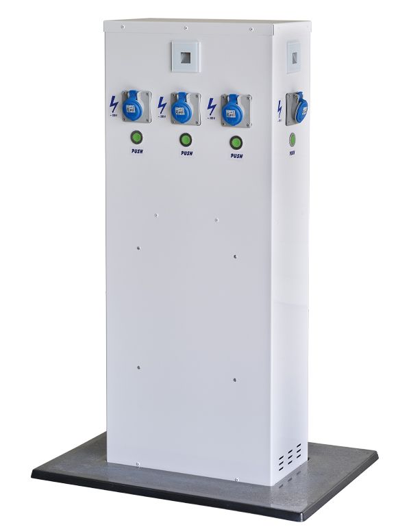 La borne EURO-PARK distribue l’énergie via 4 prises P17 monophasées, permettant le rechargement des batteries de camping-cars.