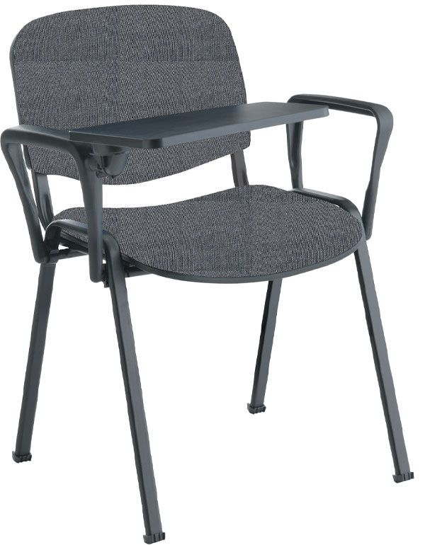 Chaise Iso empilable (hors tablette et accoudoirs), idéale pour salles de réunion, conférences ou collectivités. Piètement en acier oblong finition époxy noir, assise et dossier garnis de mousse pour un confort optimal. Tissu classé M2 anti-feu, plusieurs coloris disponibles