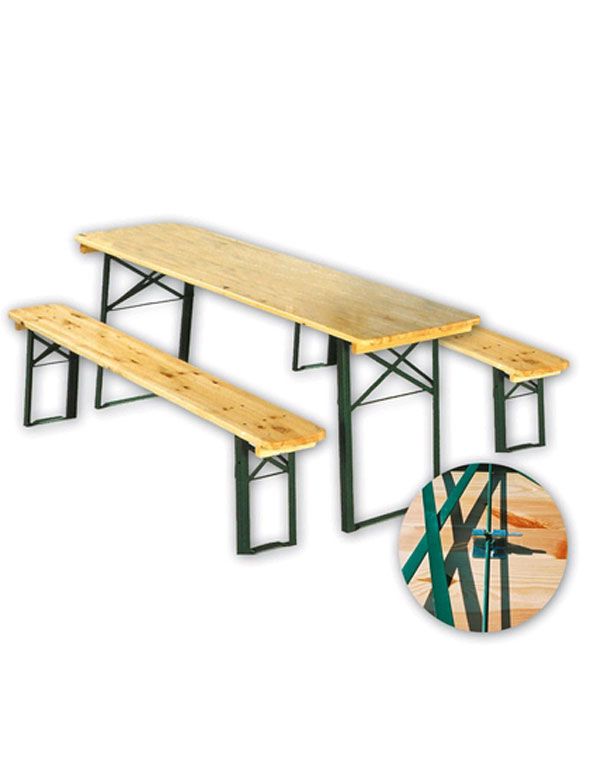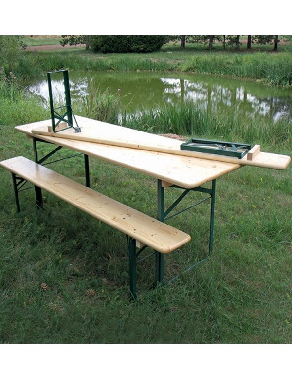 Idéal pour vos fêtes et réceptions : ensemble brasserie en bois est composé d'une table et de deux bancs pliants en pin poncé avec un dessus verni à haute résistance.