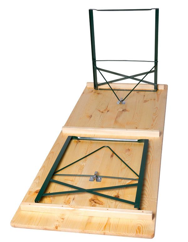 Ensemble composé d’une table et de deux bancs pliants en pin massif poncé, avec le dessus verni à haute résistance, finition marine. Épaisseur 30 mm.
