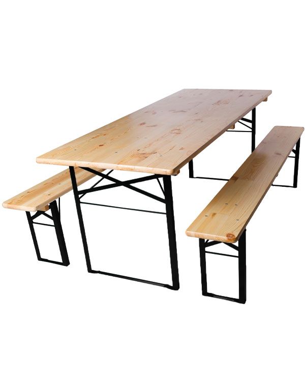 Idéal pour vos fêtes et réceptions : ensemble brasserie en bois est composé d'une table et de deux bancs pliants en pin poncé avec un dessus verni à haute résistance.