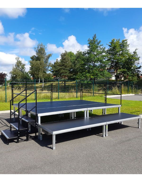 Marches antidérapantes robustes adaptées aux praticables Quick, assurant un accès confortable et sécurisé à la scène, quelles que soient les hauteurs.
