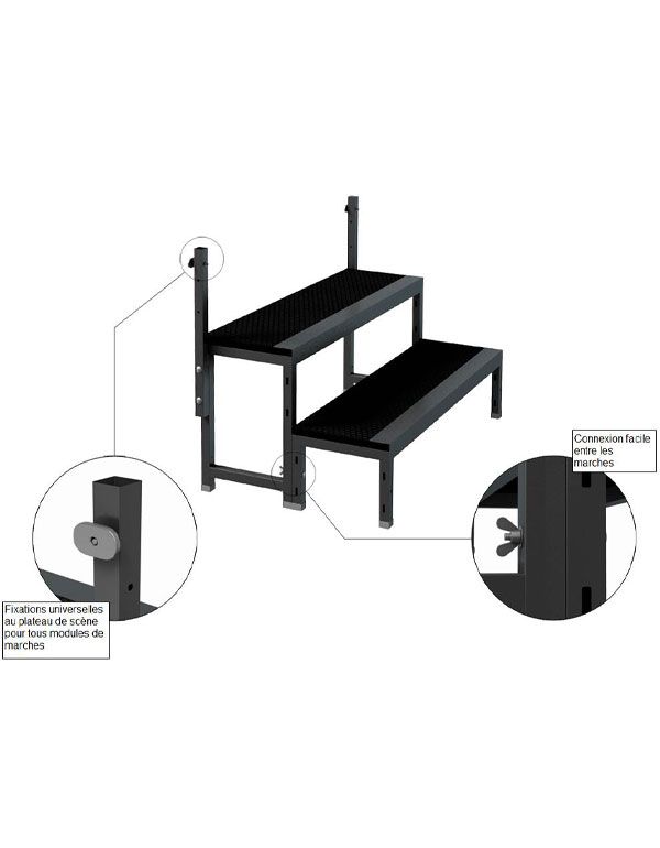 Marches antidérapantes robustes adaptées aux praticables Quick, assurant un accès confortable et sécurisé à la scène, quelles que soient les hauteurs.