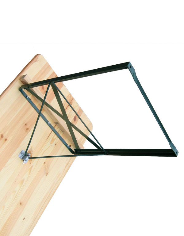 Le piètement est en tube métallique peinte d'une épaisseur de 3 mm muni d'un verrouillage par loquet. La table est munie de trois tasseaux de sécurité.